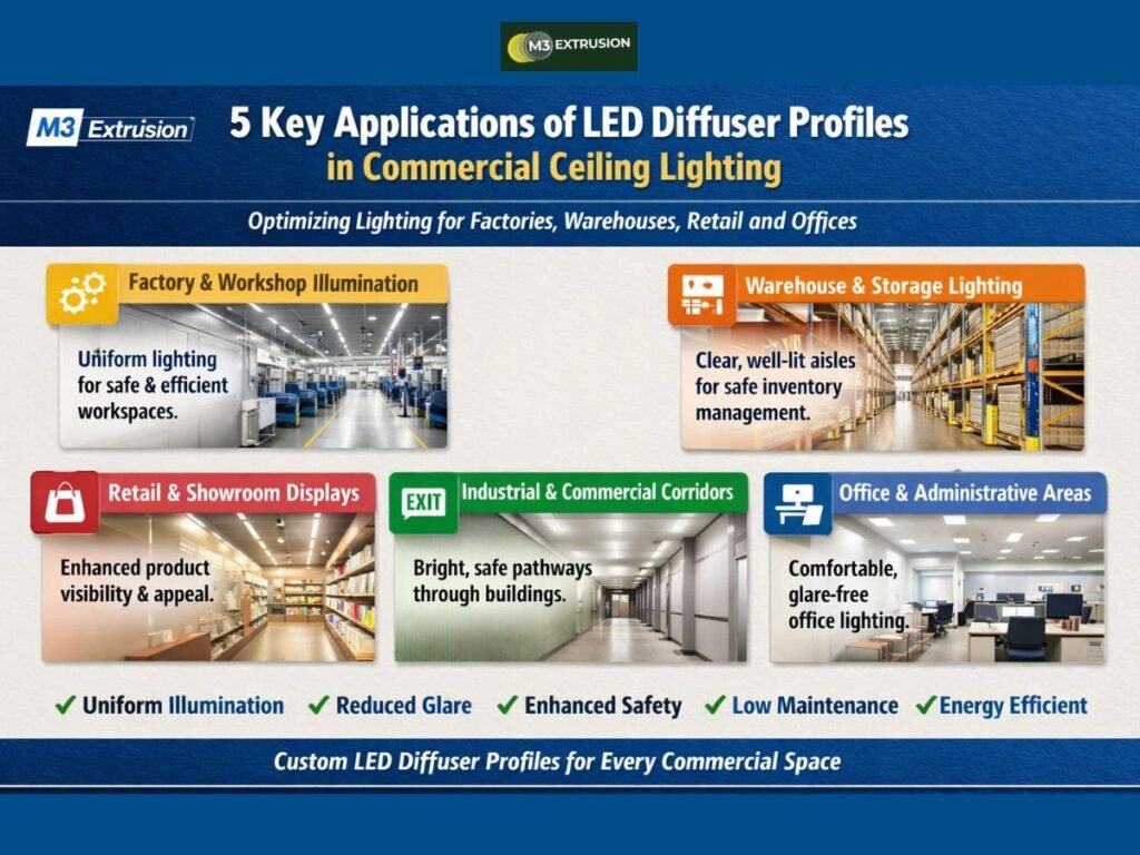By choosing the right LED diffuser profile for each space, commercial buildings can achieve efficient lighting that supports work, movement, and long-term use without added complexity. Are you looking for high-quality LED diffuser profiles in India for commercial ceiling lighting projects? M3 Extrusion offers custom LED diffuser profiles designed to meet the needs of factories, warehouses, offices, and retail spaces.