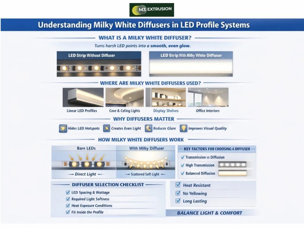 A milky white diffuser plays a quiet but critical role in LED profile systems. It shapes how light looks, feels, and performs over time. For anyone sourcing a white LED diffuser in India, understanding how these diffusers work can make the difference between a clean installation and constant complaints.