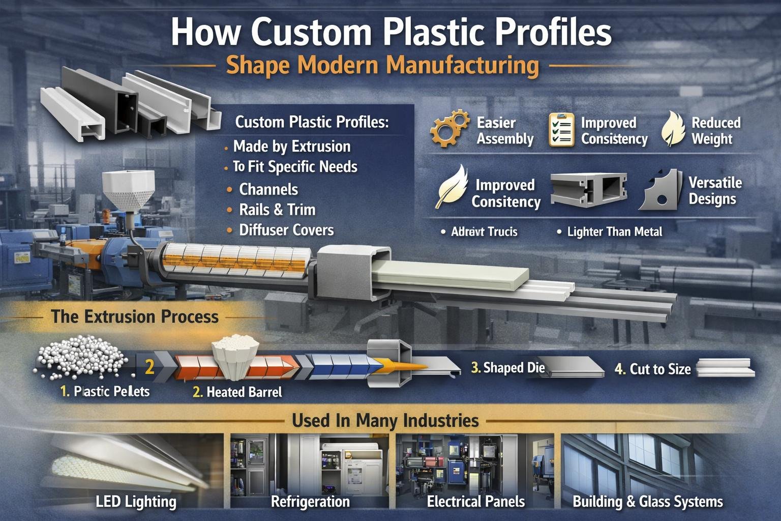 - Custom plastic profiles in manufacturing help make product assembly easier and more consistent.